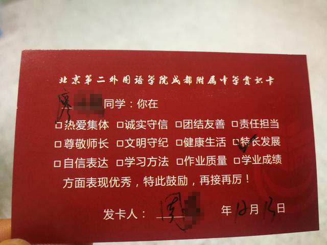 近日,一張張名片大小的卡片,讓成都新晉網(wǎng)紅學(xué)校"北二外成都附中"再次走紅。這張卡,就是該校結(jié)合自身實(shí)際進(jìn)行的學(xué)生綜合素質(zhì)評(píng)價(jià)實(shí)踐中的一項(xiàng)——”賞識(shí)卡“。僅僅經(jīng)過(guò)三個(gè)月的應(yīng)用,該校老師、家長(zhǎng)欣喜的發(fā)現(xiàn)孩子們有了可喜的變化。