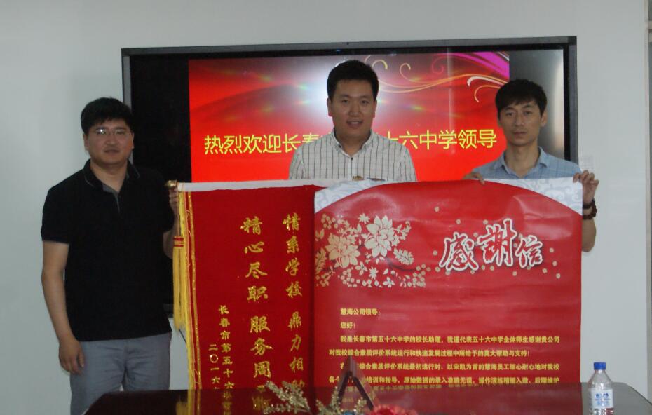 進(jìn)入驕陽似火的七月,我公司再傳喜訊。7月13日,長春市第五十六中學(xué)副校長柳鑫代表學(xué)校來到慧??萍?,專程將感謝信與錦旗送到我公司,特別向我公司實(shí)施部員工宋凱對五十六中學(xué)素質(zhì)教育綜合評價系統(tǒng)運(yùn)行和快速發(fā)展過程中給予的幫助和支持表示感謝。